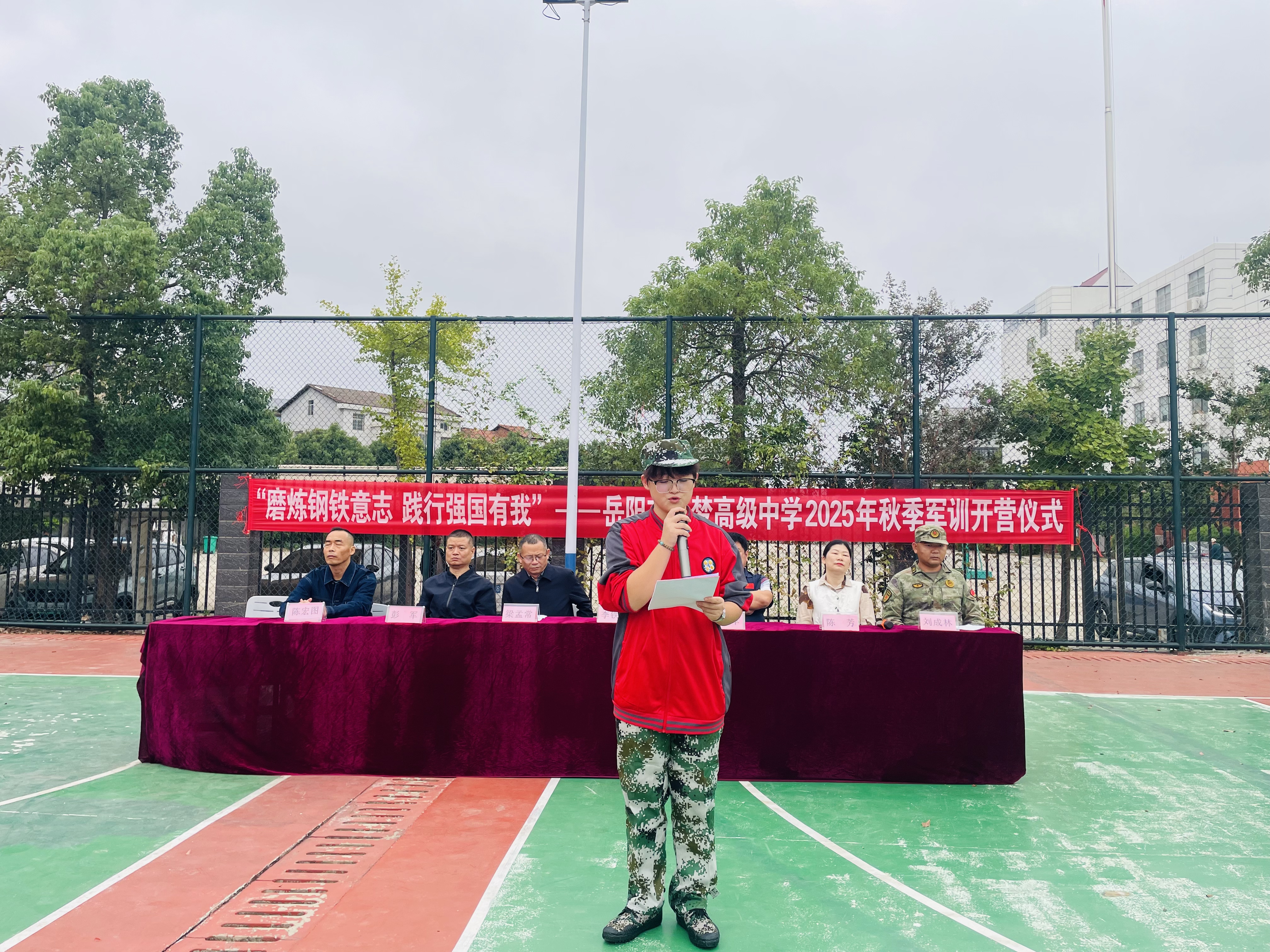 彭毅峰老师逐一介绍了出席本次开营仪式的学校领导——校长梁孟常、党支部书记李铁军、监事会主席彭军、后勤副校长曹军、办公室主任兼高一年级主任陈芳、德育处主任陈宏图和军训总教官刘成林。同学们用热烈的掌声欢迎各位领导的到来,体现了我校尊师重道的优良传统,也彰显了学校对新生军训工作的高度重视。
