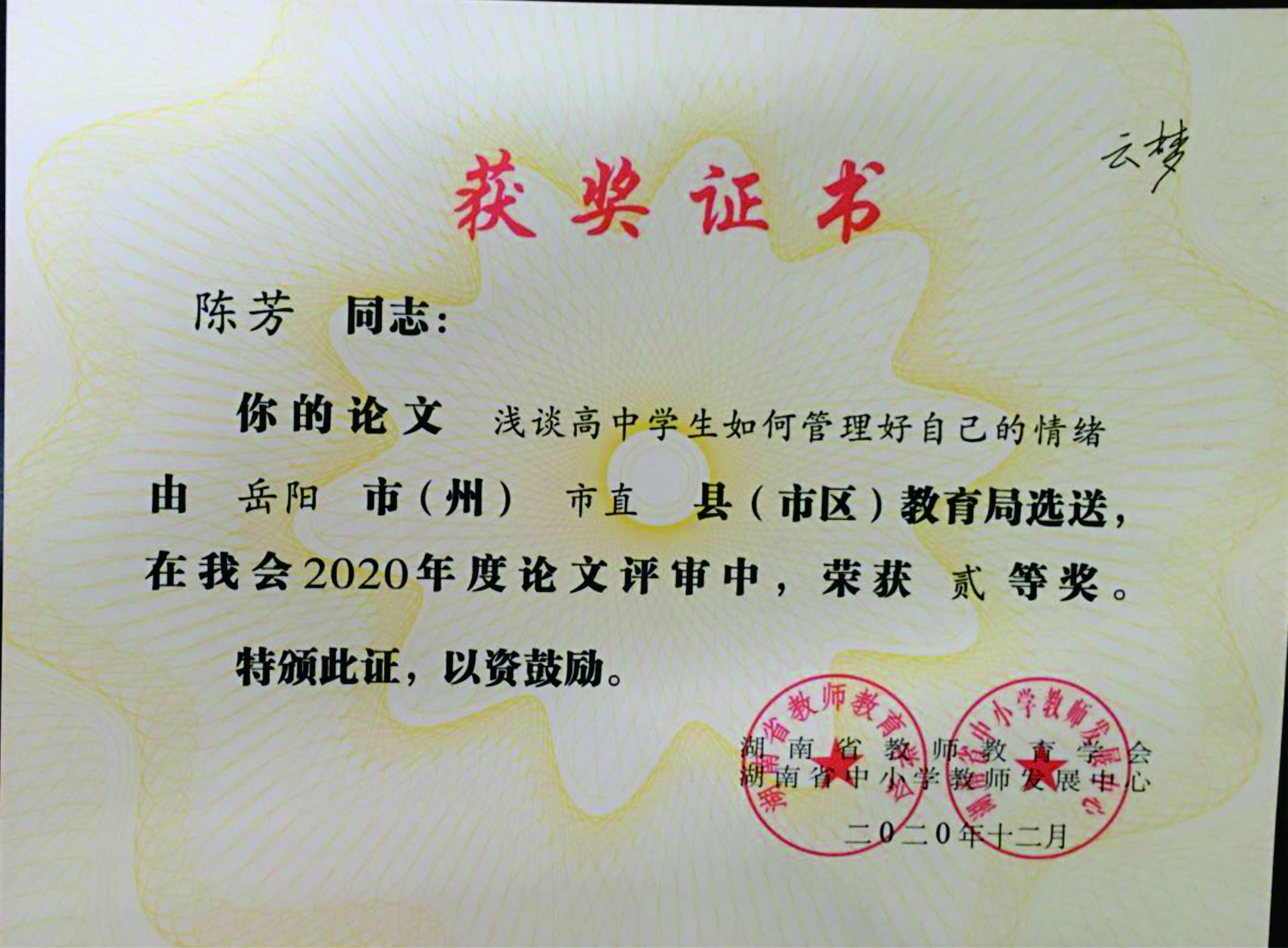 陈芳老师的论文《浅谈高中学生如何管理好自己的情绪》由岳阳市教体局选送,在湖南省教师教育学会2020年度论文评审中,荣获二等奖。