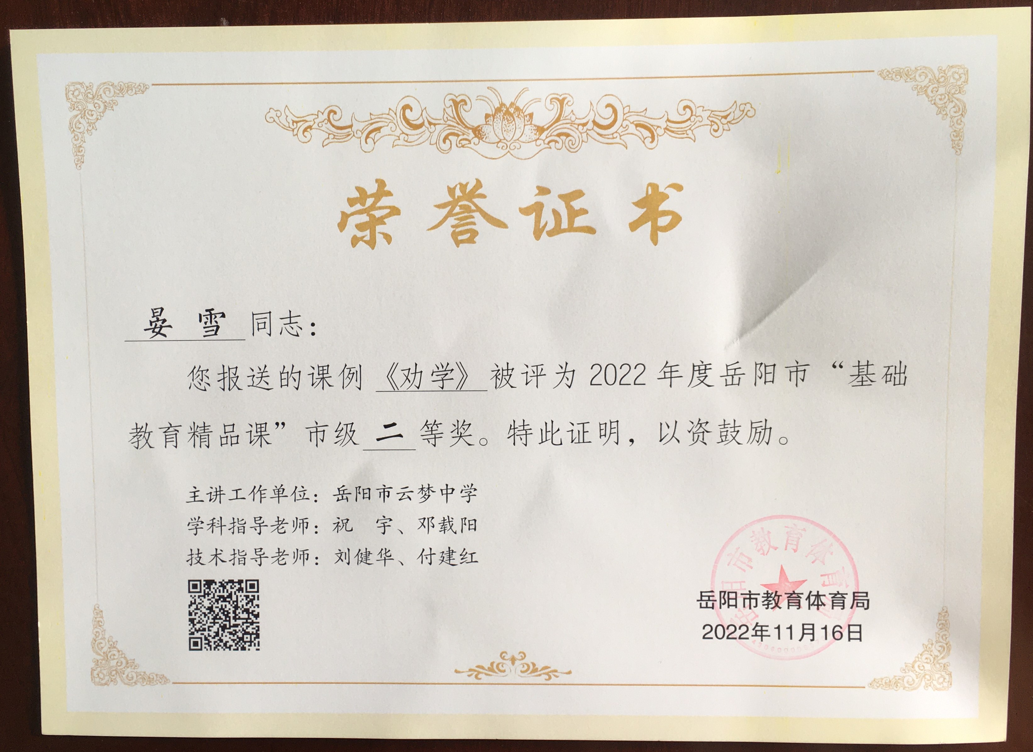 热烈祝贺我校晏雪老师的《劝学》被评为岳阳市“基础教育精品课”市级二等奖