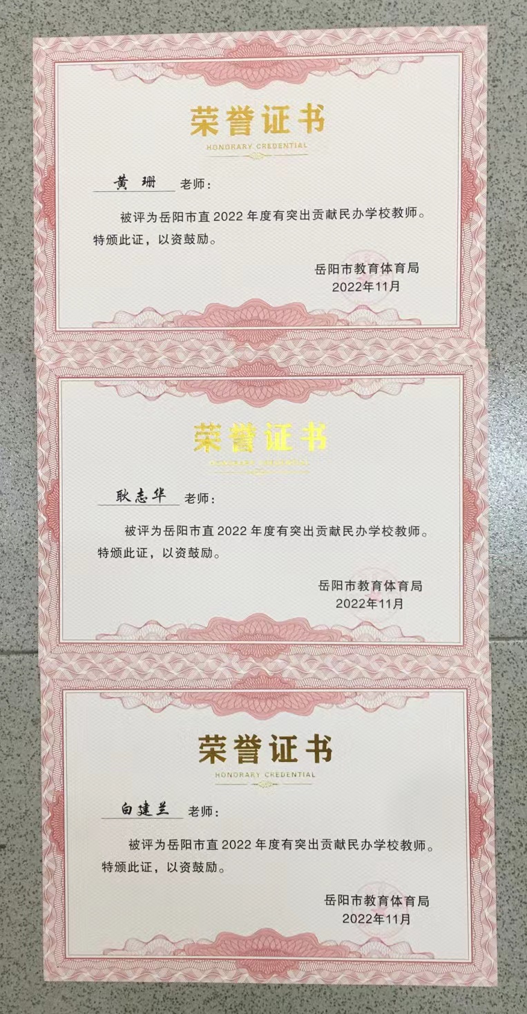 热烈祝贺我校黄珊、耿志华、白建兰老师被评为岳阳市直2022年度突出贡献民办教师!