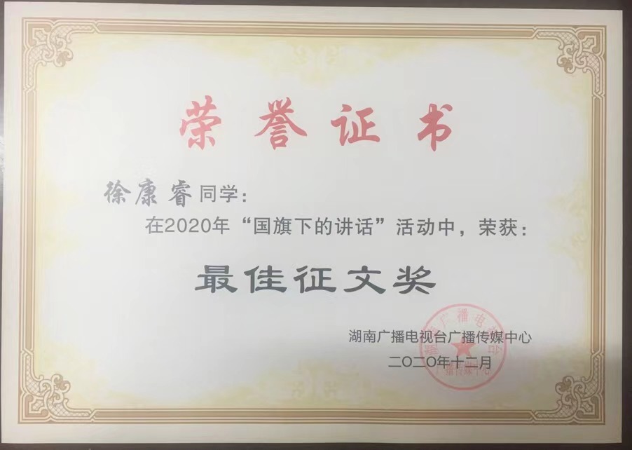 由湖南省教育厅主办的第十一期国旗下讲话《北斗领航 中国梦》征文活动中,我校高三年级119班徐康睿同学的征文获得本期国旗下讲话优秀征文