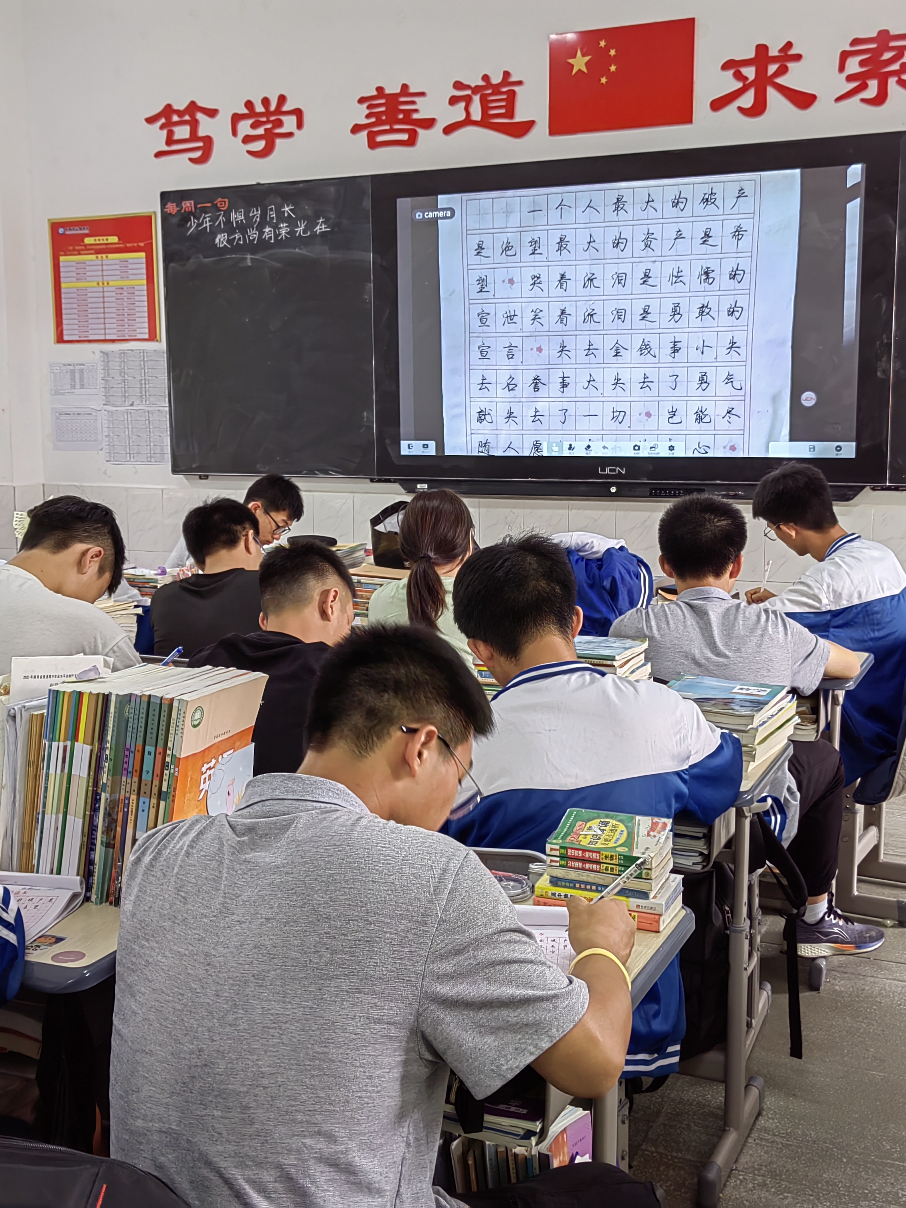 比赛开始,同学们都在认真的完成书法作品