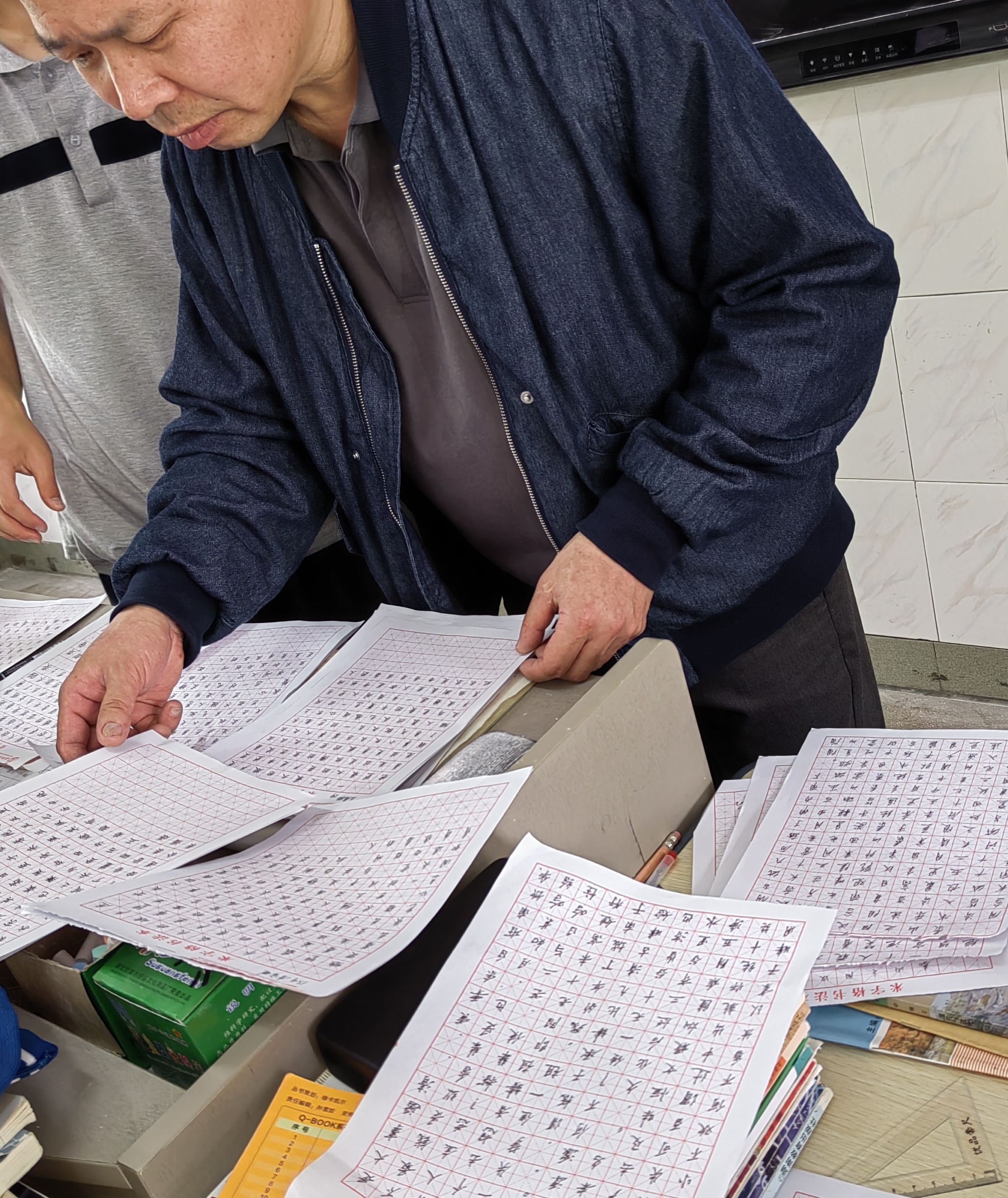 书法老师正在紧锣密鼓的评选比赛优秀作品