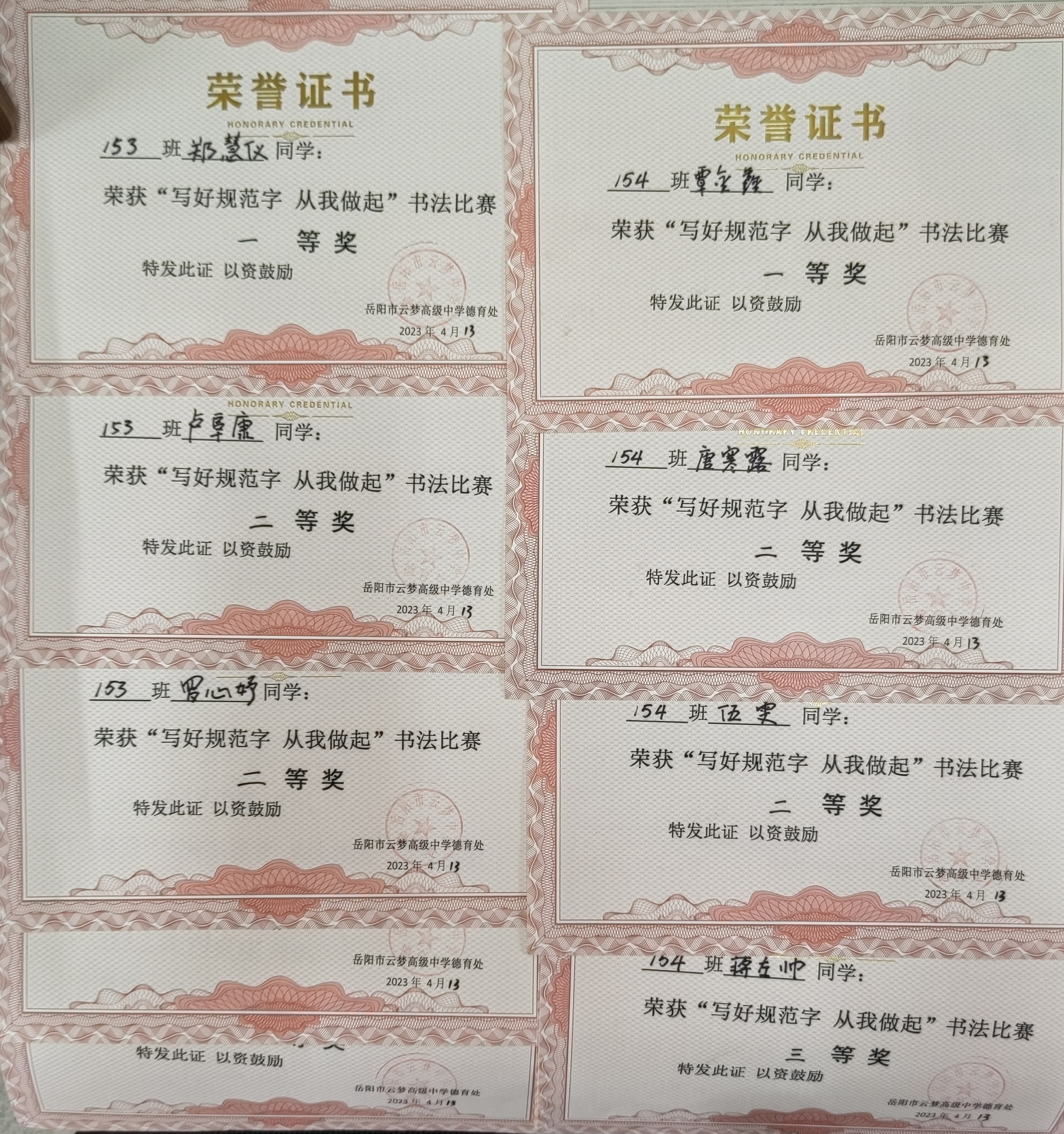 通过仔细筛选、严格评定,本次书法比赛各班共评选出一等奖1名、二等奖2名、三等奖3名、进步奖2名。