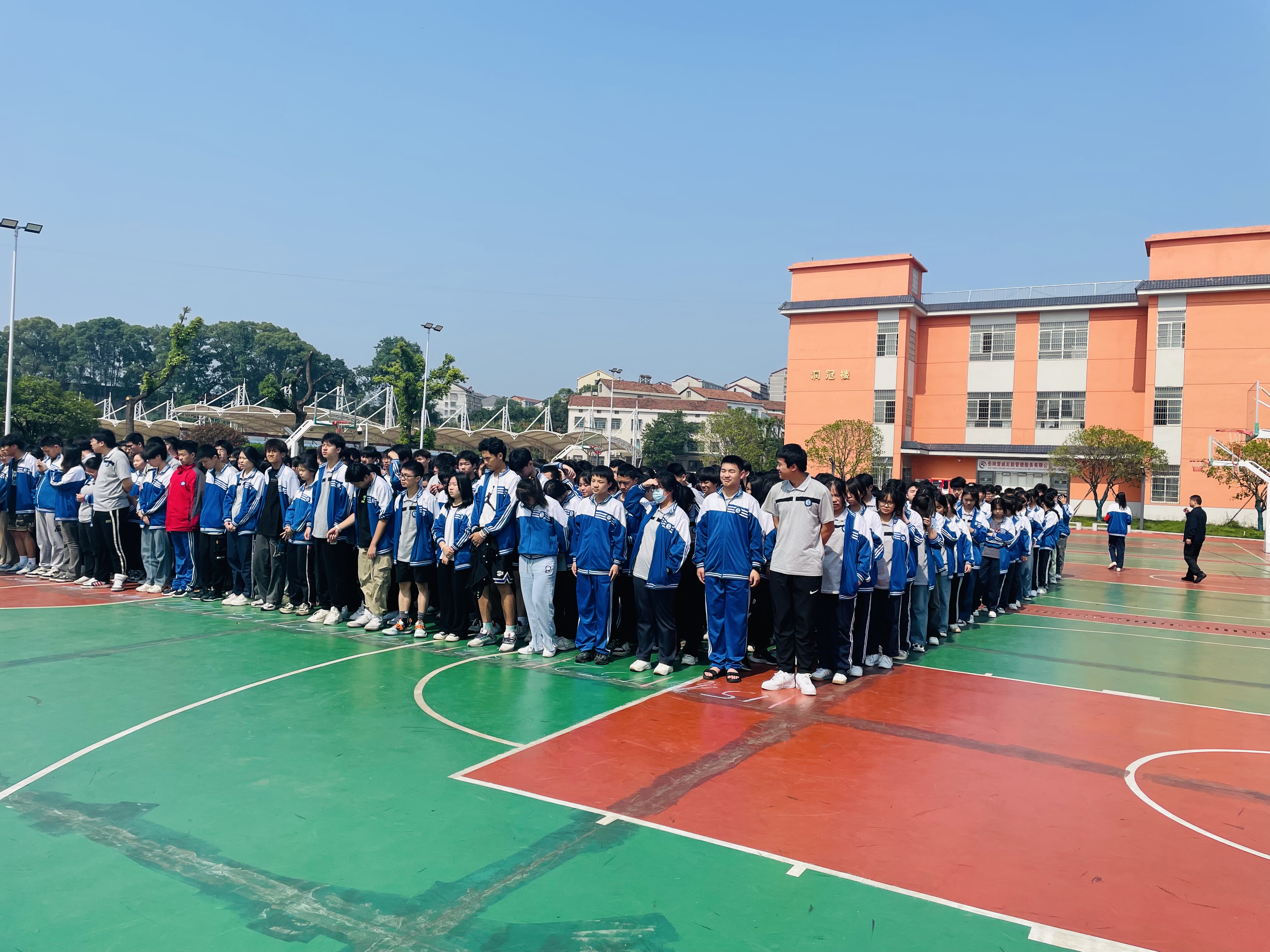 避险动作完成后,广播再次响起:“现在紧急避险结束,全体师生按疏散路线立即疏散”。各班在班主任和各负责老师的组织、带领下,用快速、猫腰、护头姿势快速疏散出教学楼。(具体疏散路线:三楼全体师生按151-156班的顺序,从东侧楼梯下楼,139班接156班,下楼后经教学楼前坪到达升旗仪式场地;四楼按134-142班的顺序,经西边党支部办公室门口后下楼;五楼按145-144的顺序从西侧楼梯直接下楼。)