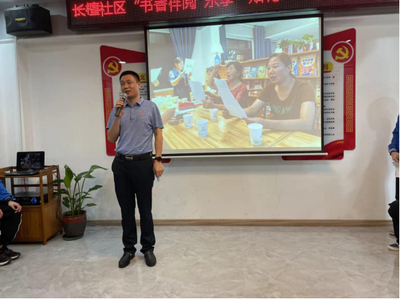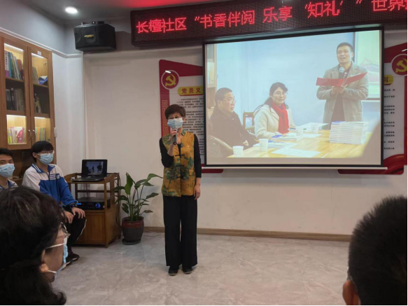 早上9点,我校学生在校团委刘嘉欣书记、德育处严芳老师的带领下准时到达了长檀社区的畔湖名苑阅读馆。我校师生按照防疫要求扫场所码、量体温进场、签到,并有秩序地坐在指定位置上等待活动的开始。