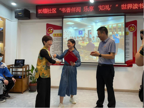 接下来是易部长给在岳阳市2021年度“雷锋家乡学雷锋”志愿服务先进典型余建霞女士颁发“最美志愿者”证书,感谢余建霞女士为畔湖名苑阅读馆的付出与努力。