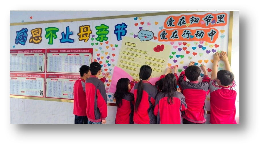 1.“感恩不止母亲节”承诺墙。母亲节前,组织全校学生书写“让妈妈少操心”“争取考试进步”等承诺卡、祝福卡。300多份流淌着真情实感的承诺卡、祝福卡搭建的“感恩不止母亲节”的承诺墙,让知识普及与情感共鸣深度交融,是孩子们心底最柔软的回响。传递的不仅仅是积极心态与责任,更成为连接亲子之心的桥梁。