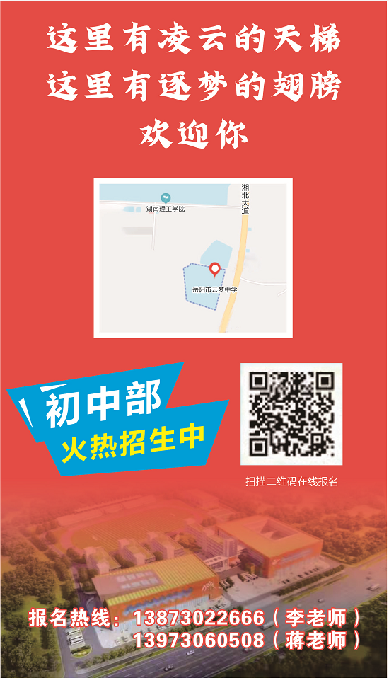 1. 网上报名:点击学校网站“岳阳市云梦中学”( http://www.hnyys-ymzx.edu.cn/ ),点击“初中部火热招生中”,下载并填写报名表,上传报名表(418131693@qq.com)。