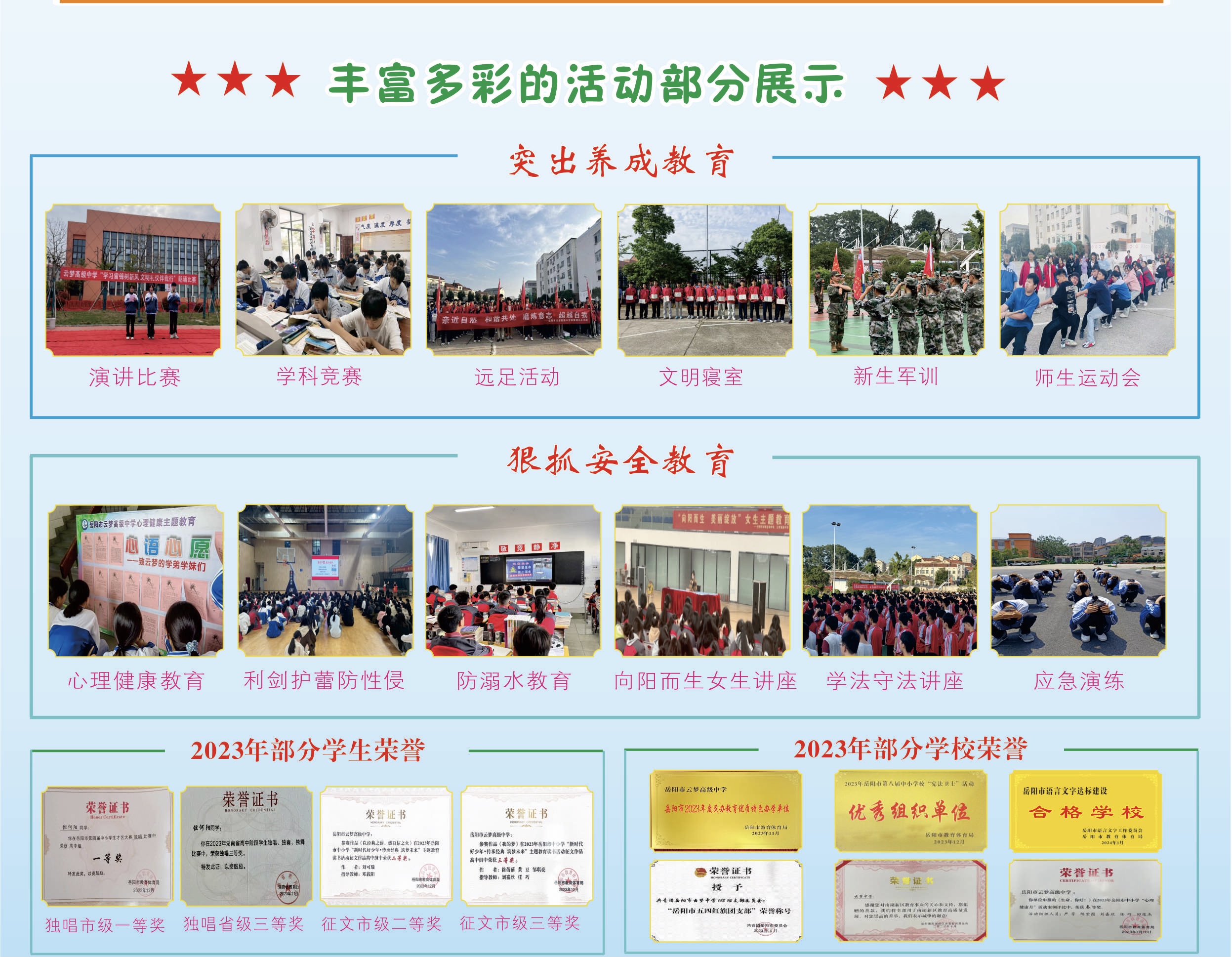 岳阳市云梦高级中学是一所办学25年历史的全日制普通民办高中,办学设施完善。教室智能教学设备、空调、直饮水系统齐备,寝室空调、热水淋浴系统齐全,食堂宽敞洁亮,饭菜营养可口。历年来,学校教育教学成效显著,受到了社会各界的认可,学校多次荣获“优秀学校”、“民办教育优质特色办学单位”等荣誉称号。