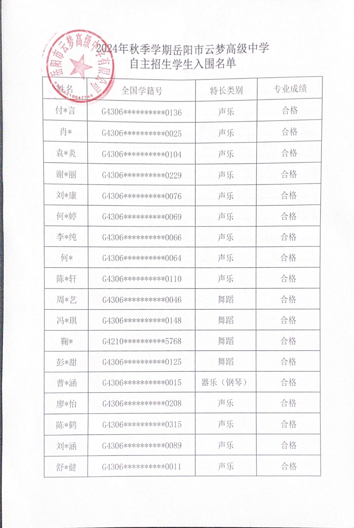 按照《岳阳市云梦高级中学2024年高中自主招生方案》,根据学生参加测试的结果,2024年高中自主招生入围学生名单公示如下: