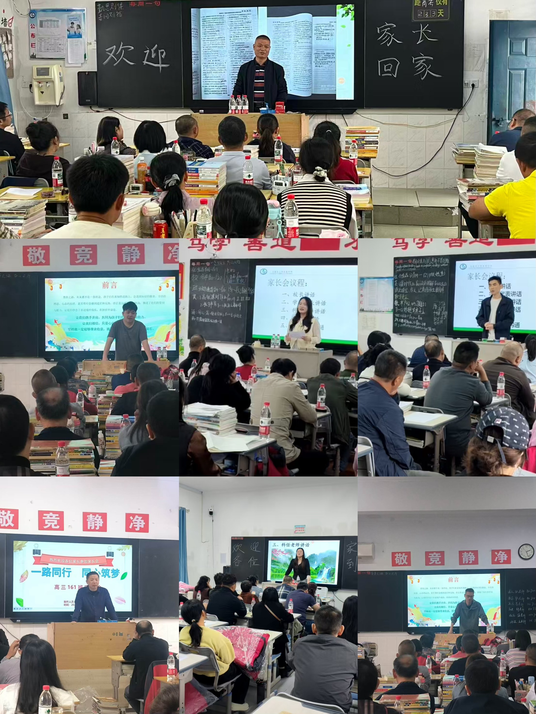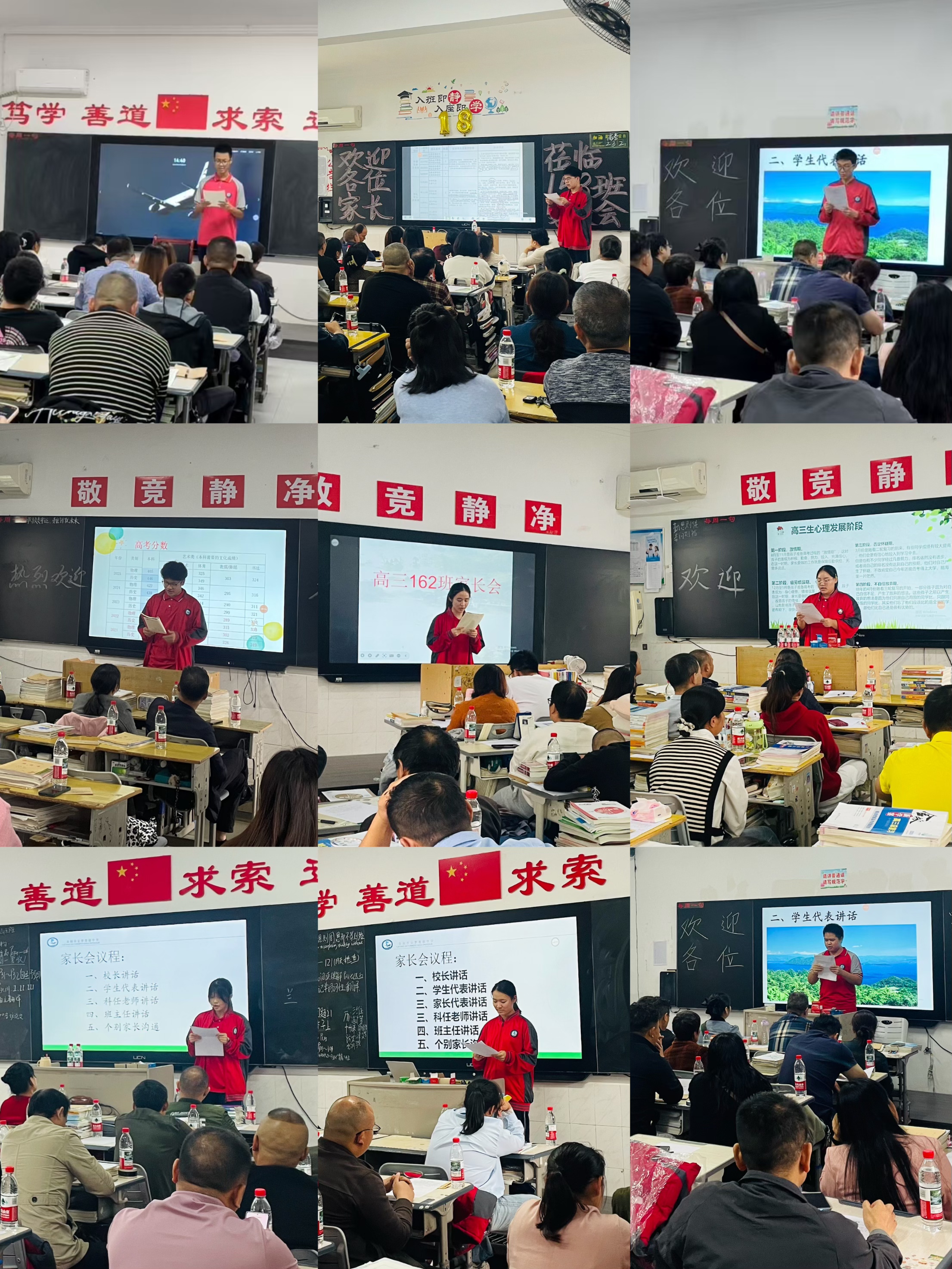 三、教师代表发言。 各科任课老师走进班级,分享了学生目前的整体学习状况,例如学习成绩、学习态度、课堂表现等方面的情况。他们分析了本学科的学习特点、当前学生的常见误区,以及针对本学科所采取的措施,强调了“课堂高效听讲”与“课后有效落实”的紧密结合。
