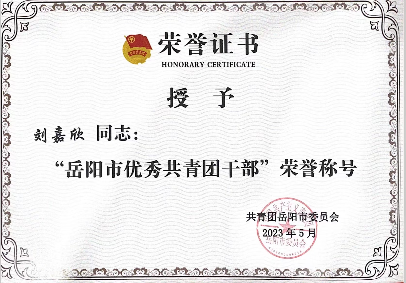 热烈祝贺我校143班团支部荣获“岳阳市五四红旗团支部”光荣称号、校团委书记刘嘉欣老师荣获“岳阳市优秀共青团干部”光荣称号