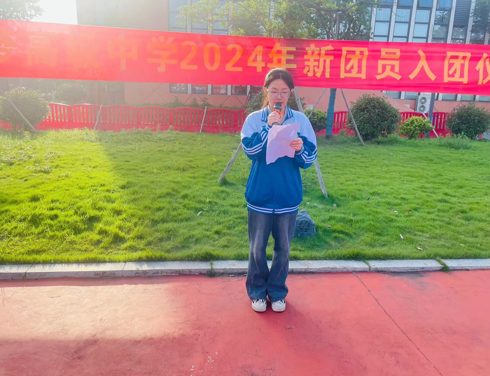 仪式第六项议程:由高三年级143班团支书熊嘉丽同学带领新团员宣誓。新团员在团旗下庄严宣誓,承诺遵守团的章程,执行团的决议,履行团员义务,发挥团员作用,为团组织的事业奋斗终身。